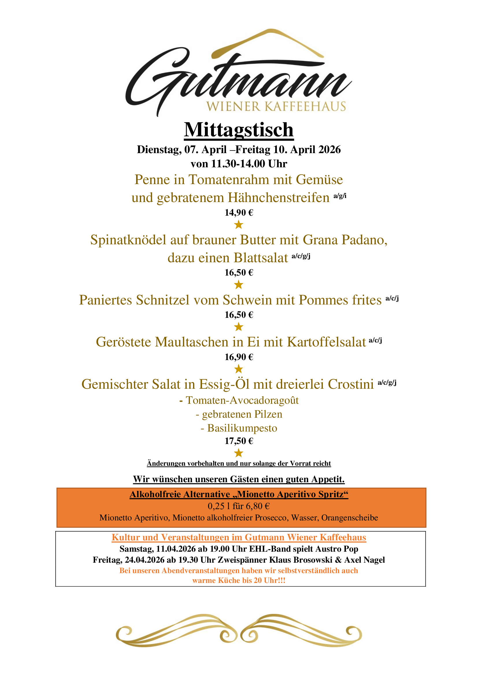Der Mittagstisch im Wiener Kaffeehaus Gutmann in Göppingen ist ideal für alle, die eine gemütliche und authentische Atmosphäre suchen, um ihre Mittagspause zu genießen. Er eignet sich besonders für Berufstätige, die eine schnelle und leckere Mahlzeit während der Arbeit suchen, aber auch für Freunde, Familien oder Kollegen, die gemeinsam eine entspannte Zeit verbringen möchten. Zudem ist der Mittagstisch perfekt für alle, die österreichische Spezialitäten und frische, qualitativ hochwertige Gerichte in einem stilvollen Ambiente schätzen. Egal ob Sie eine kurze Pause, ein Geschäftsessen oder einen entspannten Mittag mit Freunden planen – im Gutmann finden Sie die passende Gelegenheit!